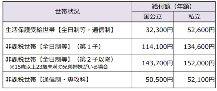 住民税非課税世帯は、返済不要の「高校生等奨学給付金制度」を利用できます。例えば全日制の公立高校に進学した場合、第1子であれば11万4100円が支給されます。