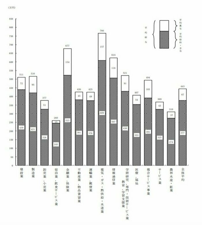 ただし年収は年齢によるところも大きく、男性であれば45~59歳で平均年収600万円を超えてきます。また業種によっても異なり、平均年収で600万円を超えるのは「電気・ガス・熱供給・水道業(766万円)」「金融業・保険業(677万円)」「情報通信業(624万円)」。
