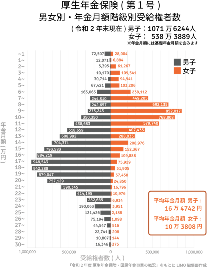 厚生労働省の「令和2年度厚生年金保険・国民年金事業の概況」によれば、今のシニア世代の厚生年金の平均月額を参考に確認していきましょう。