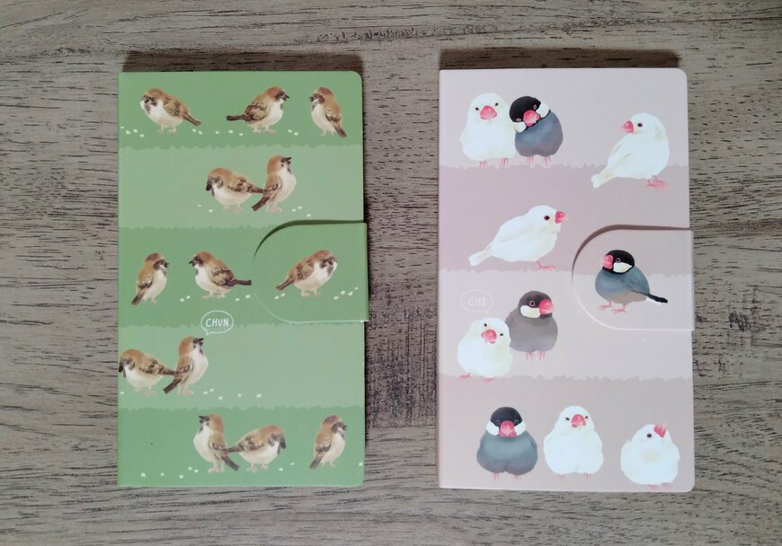 小鳥柄は、11 柄・12 柄目となる新柄となっています。スズメと文鳥の表紙が愛らしいです。下の写真のように、マグネットがついていて、しっかりと閉じることができます。