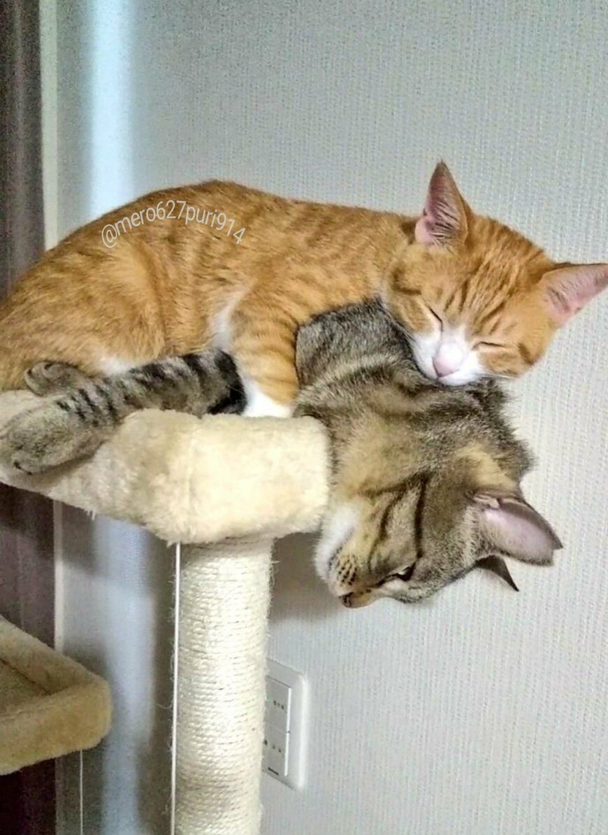 キャットタワーの上でお兄ちゃんに抱きつくプリンちゃん。愛が溢れる光景に自然と心が温まります……!