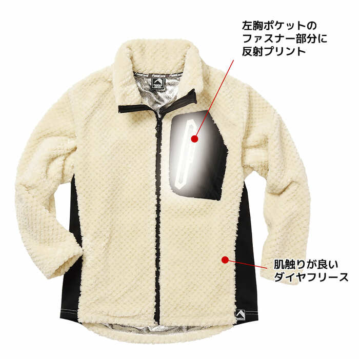 着た瞬間にポカポカのフリースジャケットです。背中の裏側は遠赤外線を放射するアルミプリント採用、寒い日はミドルインナーとしても活躍してくれます。肌触りなめらかなダイヤフリースと、脇はストレッチニット仕様なので着心地もよく動きやすいのが特徴です。左胸はファスナー付きポケットなので、物が落ちにくく、反射プリントも付いています。