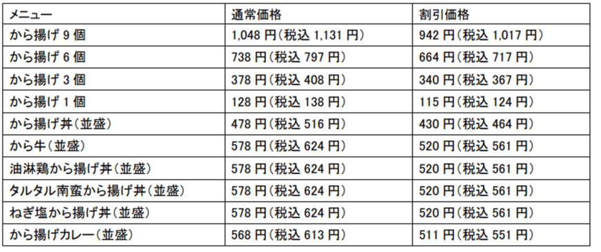 『から揚げテイクアクト全品10%オフキャンペーン』は、から揚げ対象商品をテイクアウトで購入した場合、税込価格から10%割引した価格で提供するキャンペーンです。