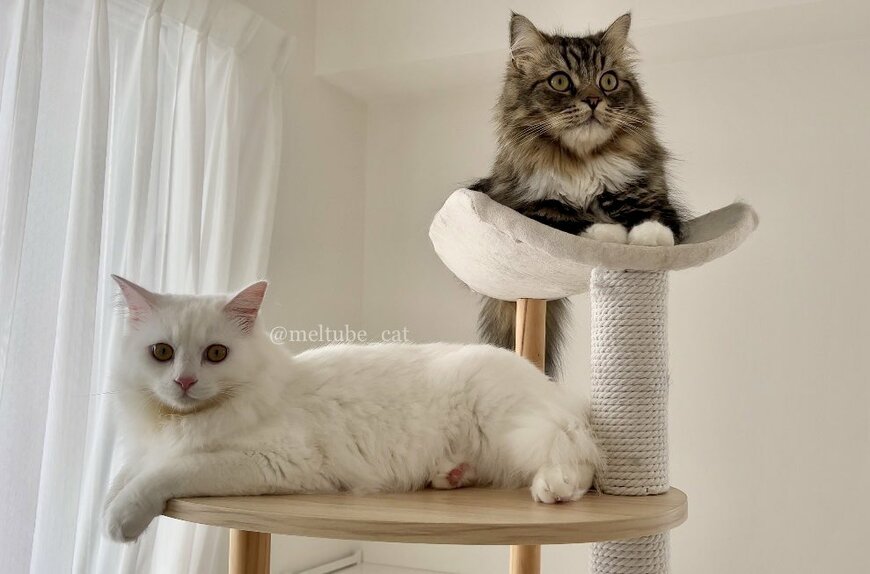 写真に写っているのは、2匹の猫ちゃん。現在1歳の白猫「マオ」くんと、2歳のキジ猫「メル」くんです。