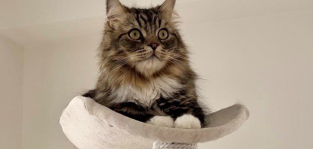 キャットタワーの上の方で、一点を見つめながら座るメルくん。靴下のような手の模様がなんとも愛らしくて、凛と座る姿に癒されてしまいます……!