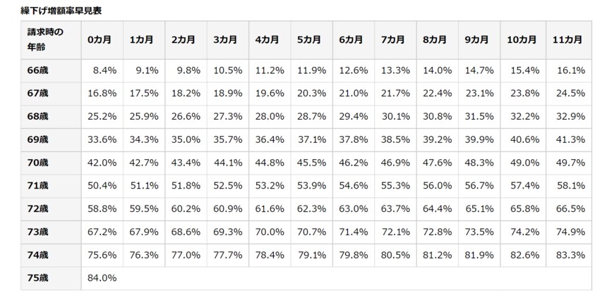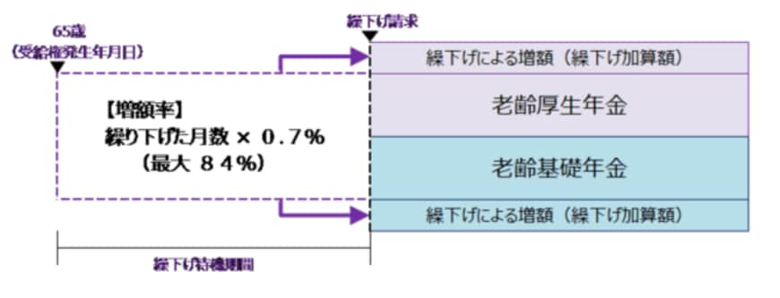 65歳から年金を受け取る場合の金額を100%とすると、受給開始を1カ月遅らせると、受け取れる金額が0.7%ずつ増えます。1年遅らせて受給したら8.4%の増加。最長75歳まで繰り下げられ、10年間での増加率で考えると最大84%の増額となります。