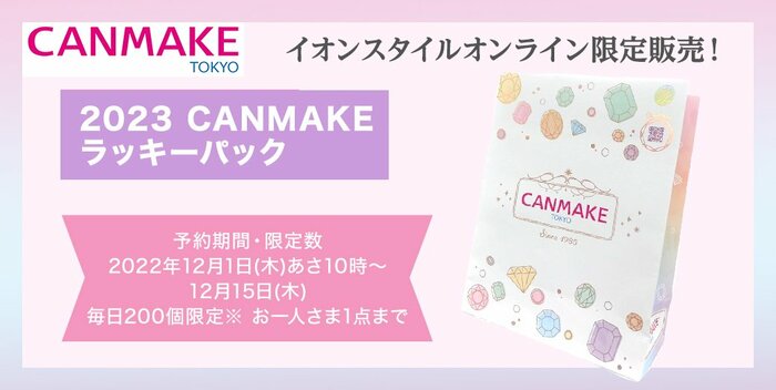 イオンスタイルオンラインでは2022年12月1日(木)から12月15日(木)の間、「2023 CANMAKE(キャンメイク) ラッキーパック」の限定販売をおこないます。今年は、イオン・イオンスタイルの店頭での販売はなく、オンラインでの販売のみとなります。
