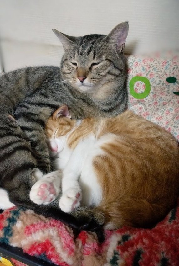 「ぬくぬく」という書き込みとともに、1枚の写真が投稿されました。写真に写っているのは、2匹の猫ちゃんがぴったりと密着して眠る光景です。