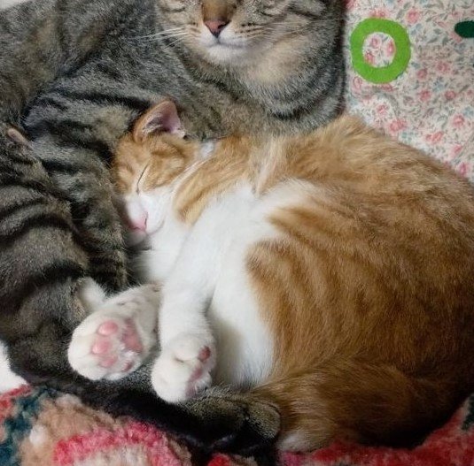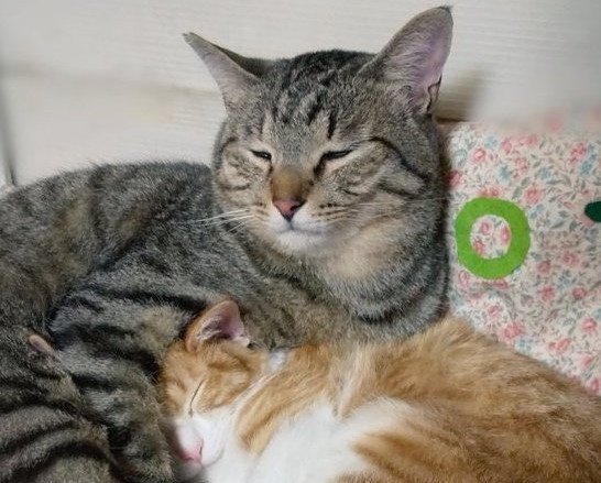 一方でプリンちゃんは、安心しきったように熟睡している様子。「お兄ちゃんの腕の中は安心するニャ…」なんて声が聞こえてきそうです。
