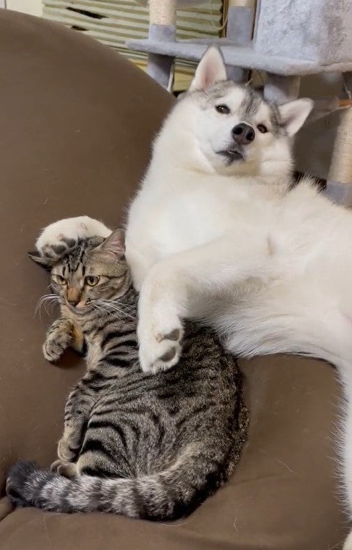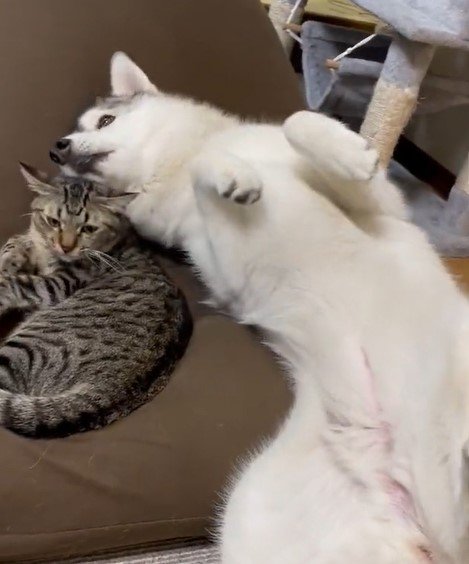 動画に写っていたのは、ヨギボーでくつろぐ犬と猫の姿でした。キジトラ猫の男の子「サンくん」と、シベリアンハスキーの「ユキ」ちゃんです。
