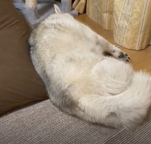 ユキちゃんはちょっと虚しそうな表情を浮かべながら寝転がっています。ツイートどおり「落ちちゃった……!」なんて心の声が聞こえてきそう……!