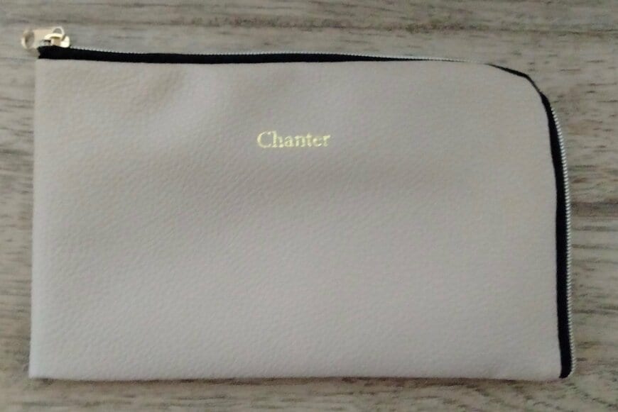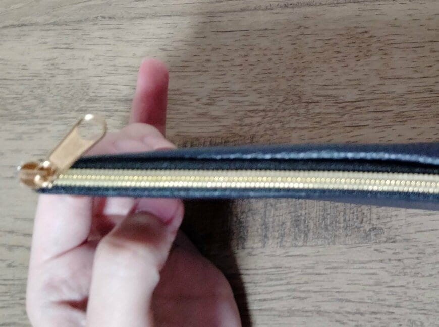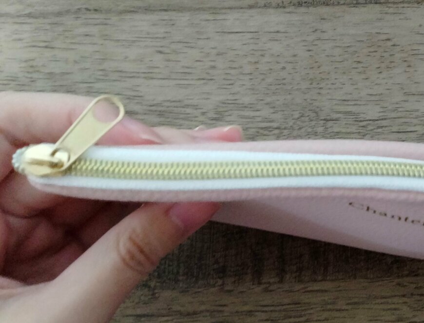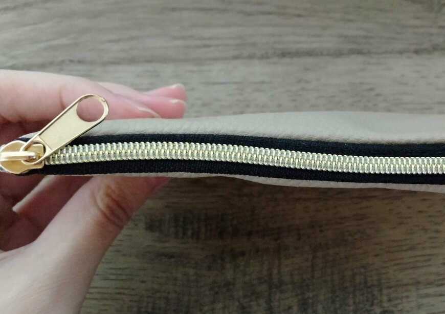 こちらはベージュデザインです。ファスナーは下の写真のように、ゴールドカラーとなっています。ファスナーの土台はブラックです。ベージュとブラックのコントラストも素敵です。
