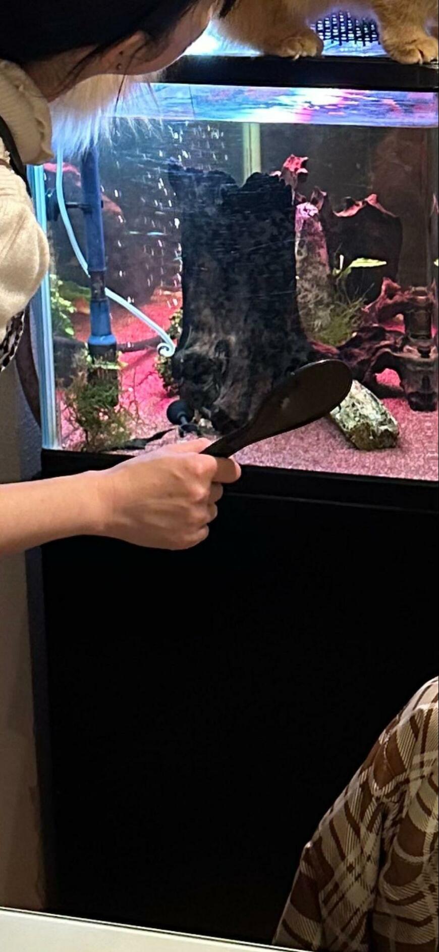 「水槽の上に乗った猫を注意しに行った嫁氏の姿が、しゃもじのせいで突然隣の晩御飯。」そんな書き込みとともに投稿されたのは、2枚の写真でした。