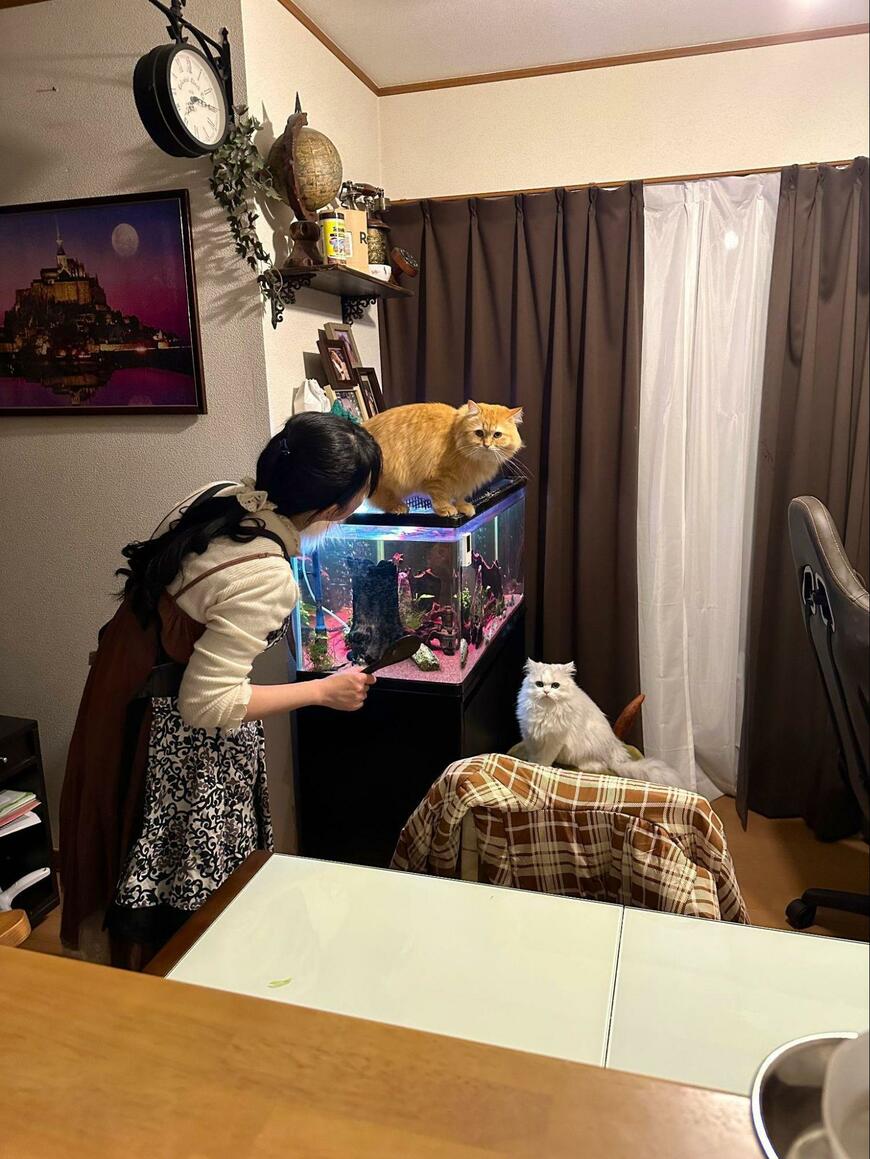 写真に写っているのは、2匹の猫ちゃんとママさんです。どうやら水槽に乗った猫ちゃんを見て、ママさんは注意しに行ったようですが……?