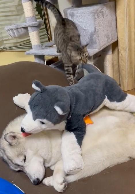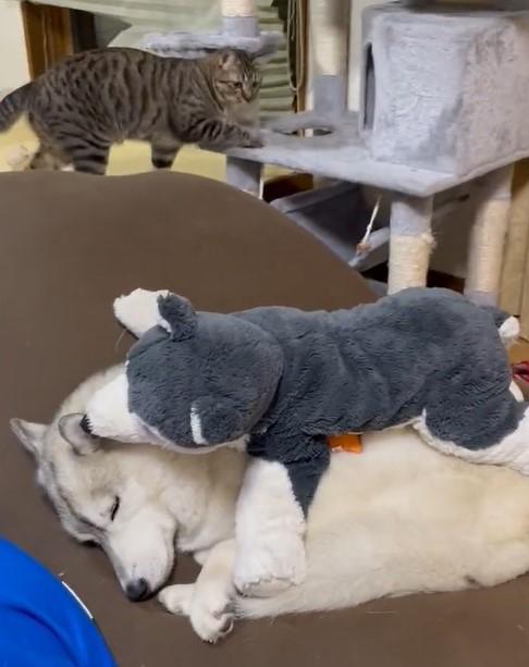 ぬいぐるみにやきもちを妬いてしまった猫ちゃんの姿が話題に