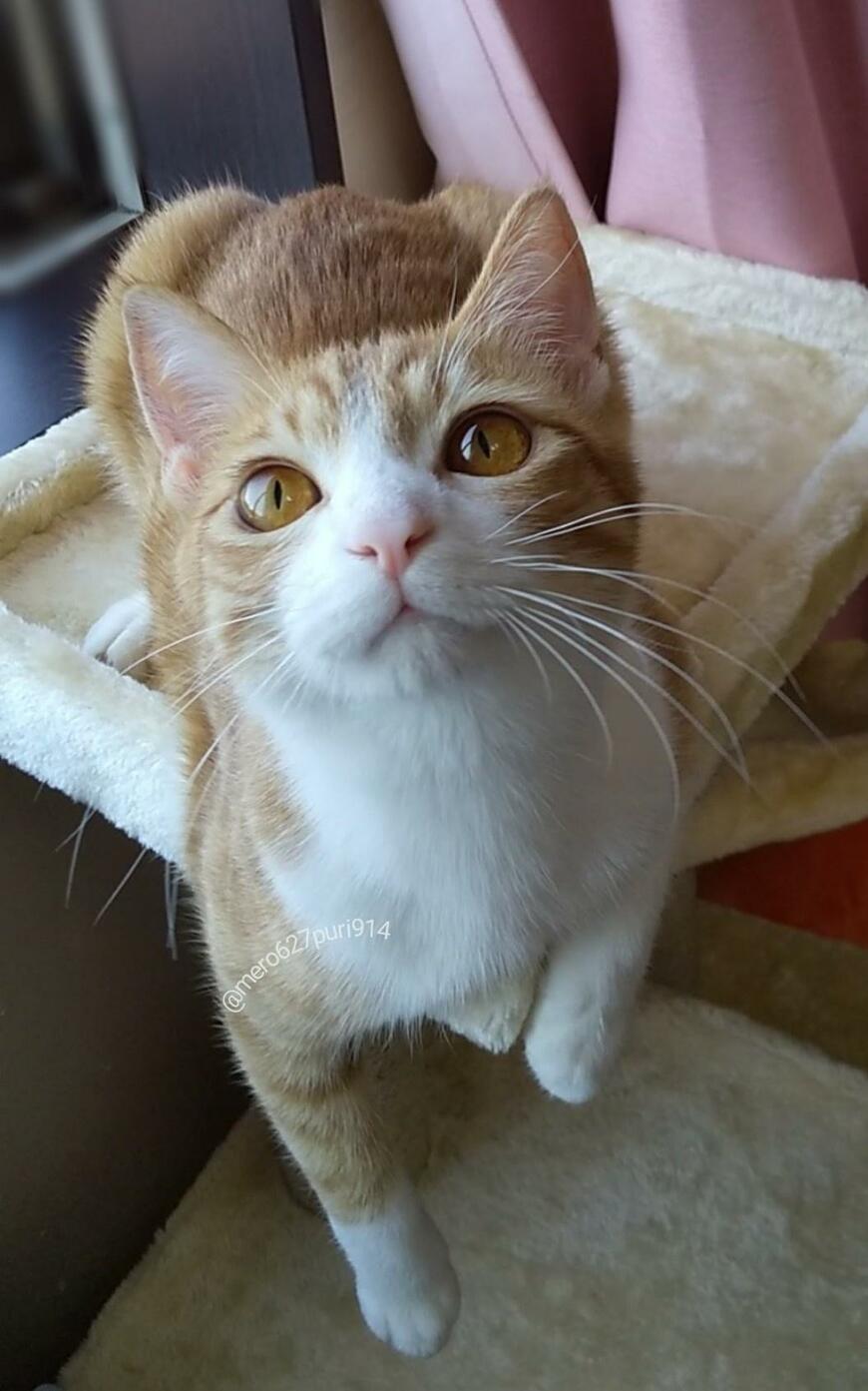 写っているのは、キャットタワーの上でゆったりとした表情を浮かべる猫ちゃん。名前は「プリン」ちゃんで、推定1歳の女の子です。