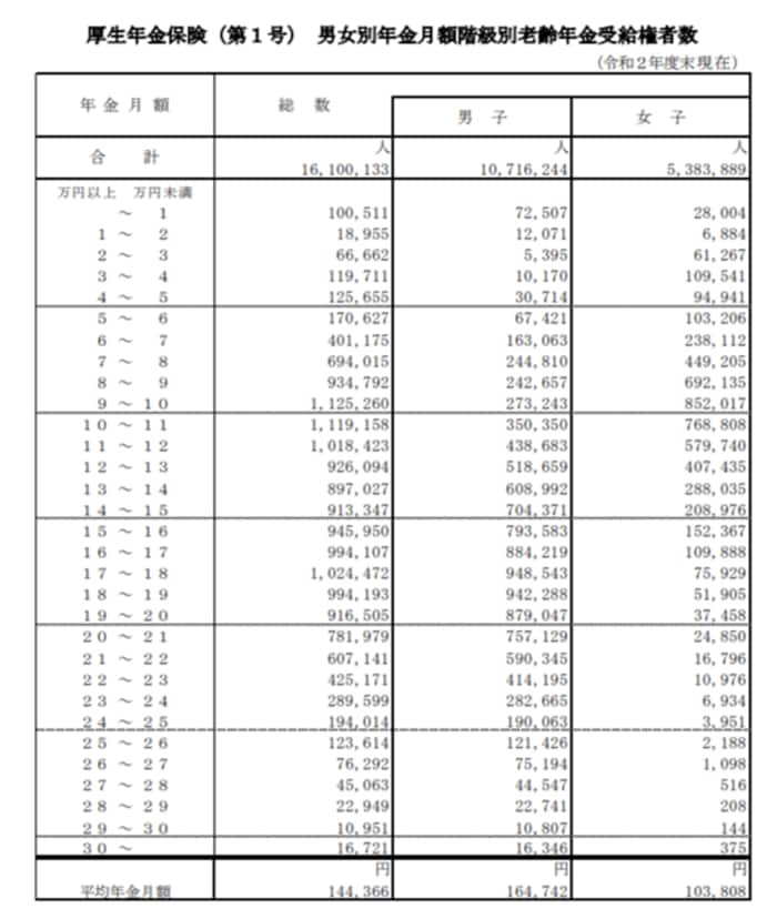 公務員や会社員等が加入する厚生年金について、厚生労働省年金局の「令和2年度 厚生年金保険・国民年金事業の概況」から受給額を見ていきましょう。