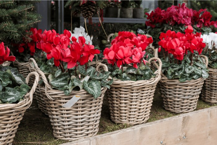 お歳暮などに贈られることが多いシクラメンも、パーティーの手土産に人気の花。赤や白、ピンクや黄色などさまざまな花色があり、冬から翌春にかけてエレガントな花が楽しめます。