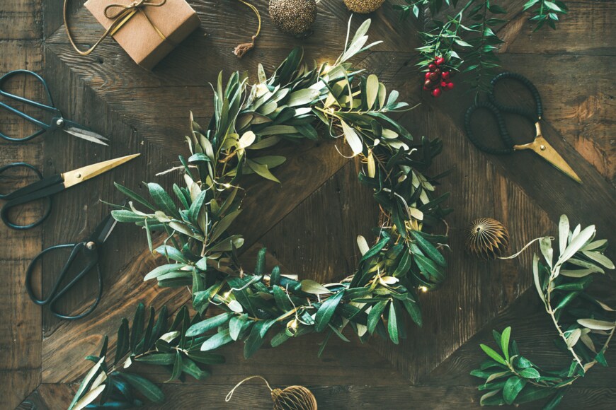 ユーカリやオリーブもクリスマスリースにオススメ。クリスマスリースには針葉樹の葉がよく用いられるため、丸い葉や細長い葉の植物はリースのアクセントになります。特に枝がしなやかなオリーブはリースの土台として使用してもよいでしょう。