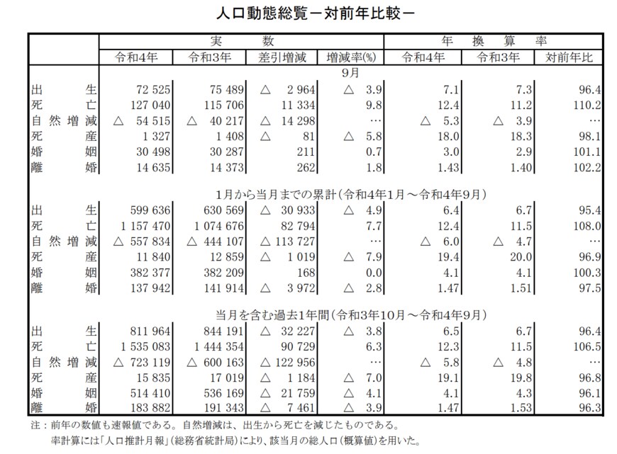 厚生労働省が2022年11月25日に公表した「人口動態統計速報 (令和4年9月分) 」によれば、今年1月から9月までの累計の出生数は59万9636人でした。
