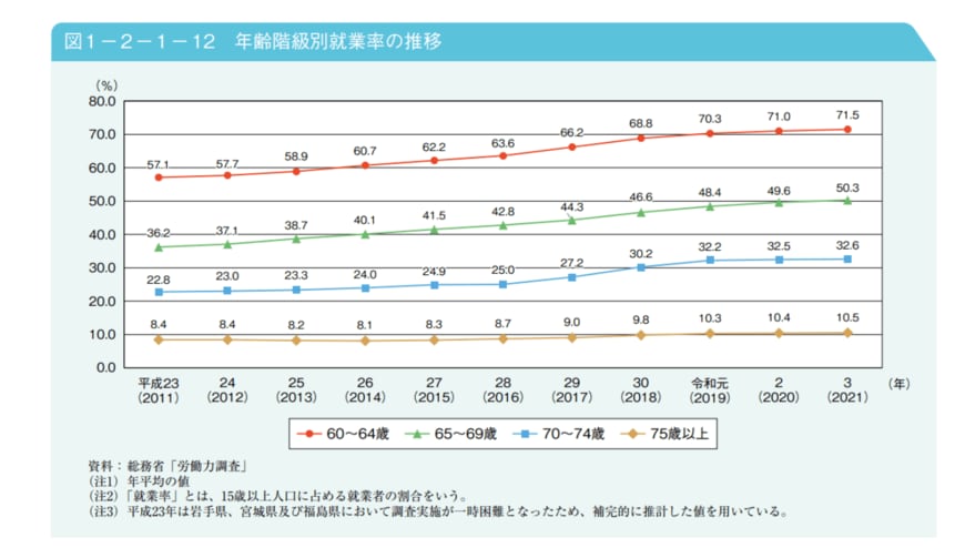 内閣府の「令和4年版高齢社会白書(全体版)」によれば、60代の就業率を2011年と2020年で比較すると、以下のようになっています。