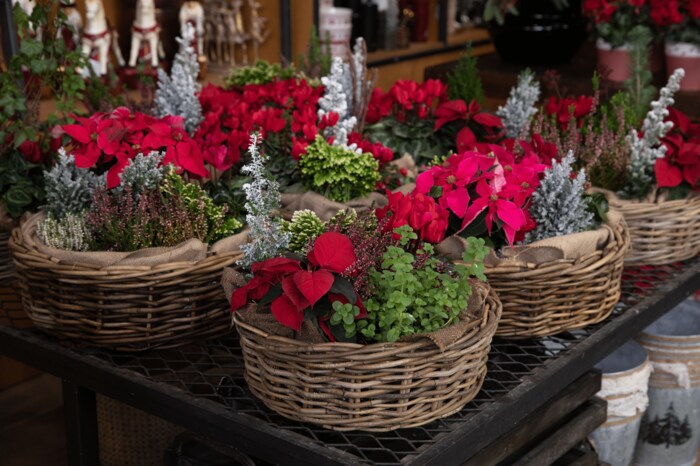 カゴいっぱいに詰められたさまざまな植物。葉の色や形のバリエーションが楽しめます。このままリボンを掛ければステキなクリスマスプレゼントに。