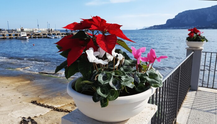 ウィンターシーズンの鉢花を代表するポインセチアとシクラメン。お互いに引き立て合いながら、シンプルな美しさを表現しています。