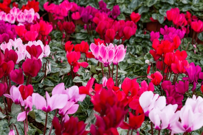 冬の鉢花として高い人気を誇るシクラメン。赤やピンクの鮮やかな花色が、寒々とした冬の室内にホッとするような暖かさをもたらしてくれます。うつ向いて開く花が控えめで健気な印象。