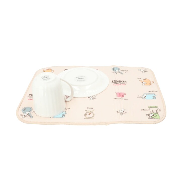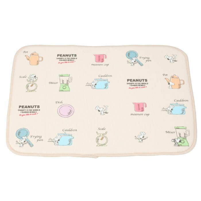 こちらの「水切りマット」はスヌーピーとキッチン小物の描かれたマイクロファイバーの布です。大物の食器や鍋を洗った後で水気を切るために一時置きたいときに使います。