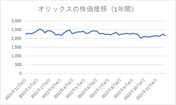 最後に、オリックスの過去1年間の株価推移を週間チャートで確認します。