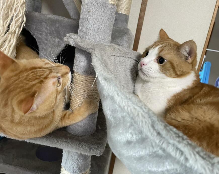 リチャードちゃんは「ばぁ!」といった具合でキャットタワーから顔を出しています。ダーウィンくんに構ってほしくて、驚かそうとしているのでしょうか……!