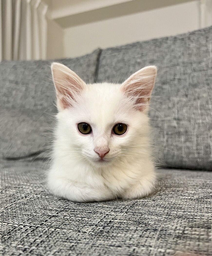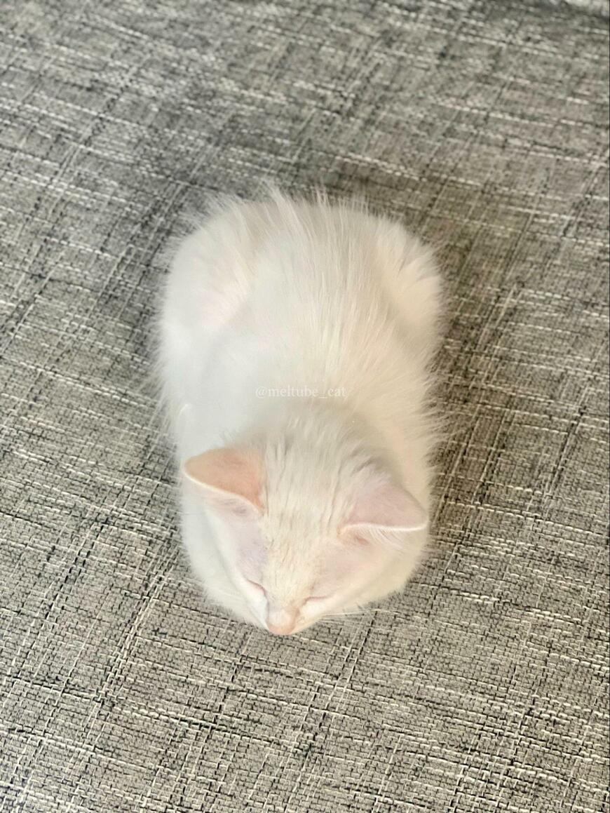 写っているのは白猫の男の子「マオ」くんです。手をじょうずに体の下に入れ込んで、見事な「おててないない」を披露していますね。