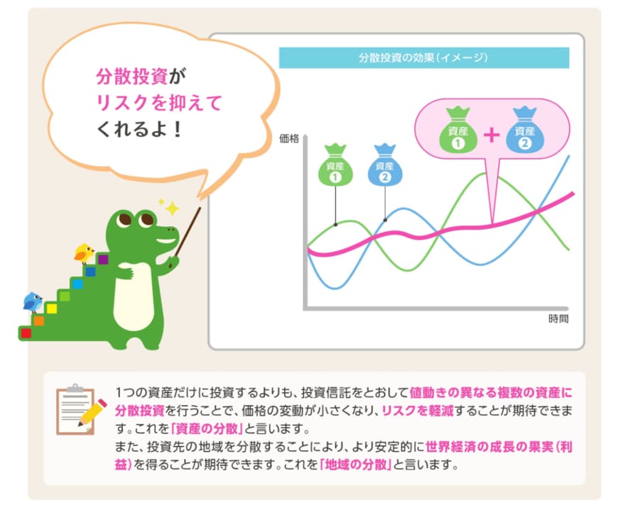 1つの商品の価格が下がってしまっても大きな損をすることがないように、リスクを分散することができます。