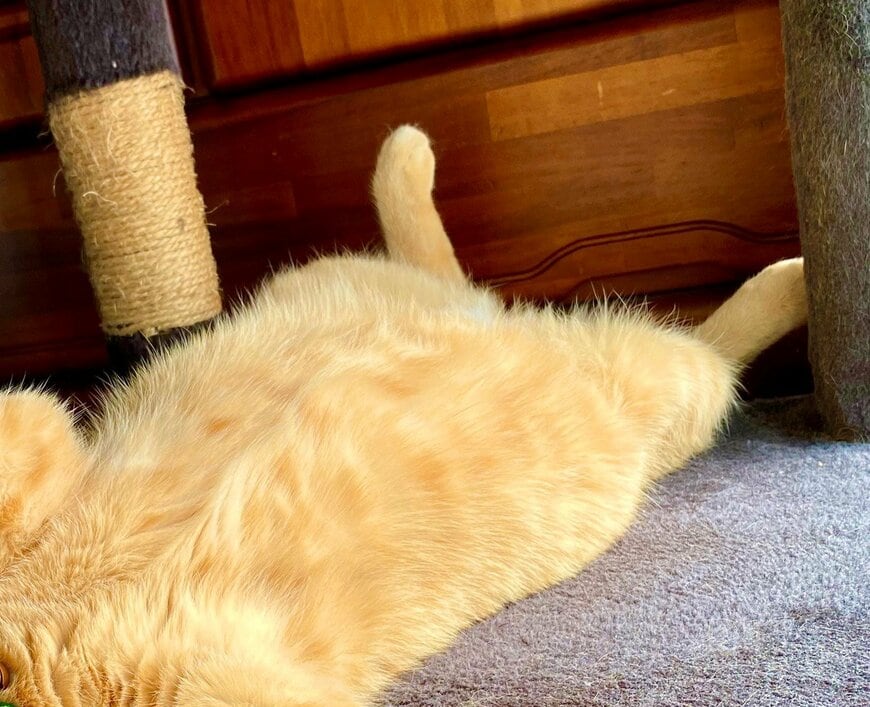 モカくんは仰向けになって、可愛いお腹を惜しげもなく披露しています。加えて手足まで大きく開いたその姿からは、警戒心など微塵も感じられずホッコリしてしまいます……!