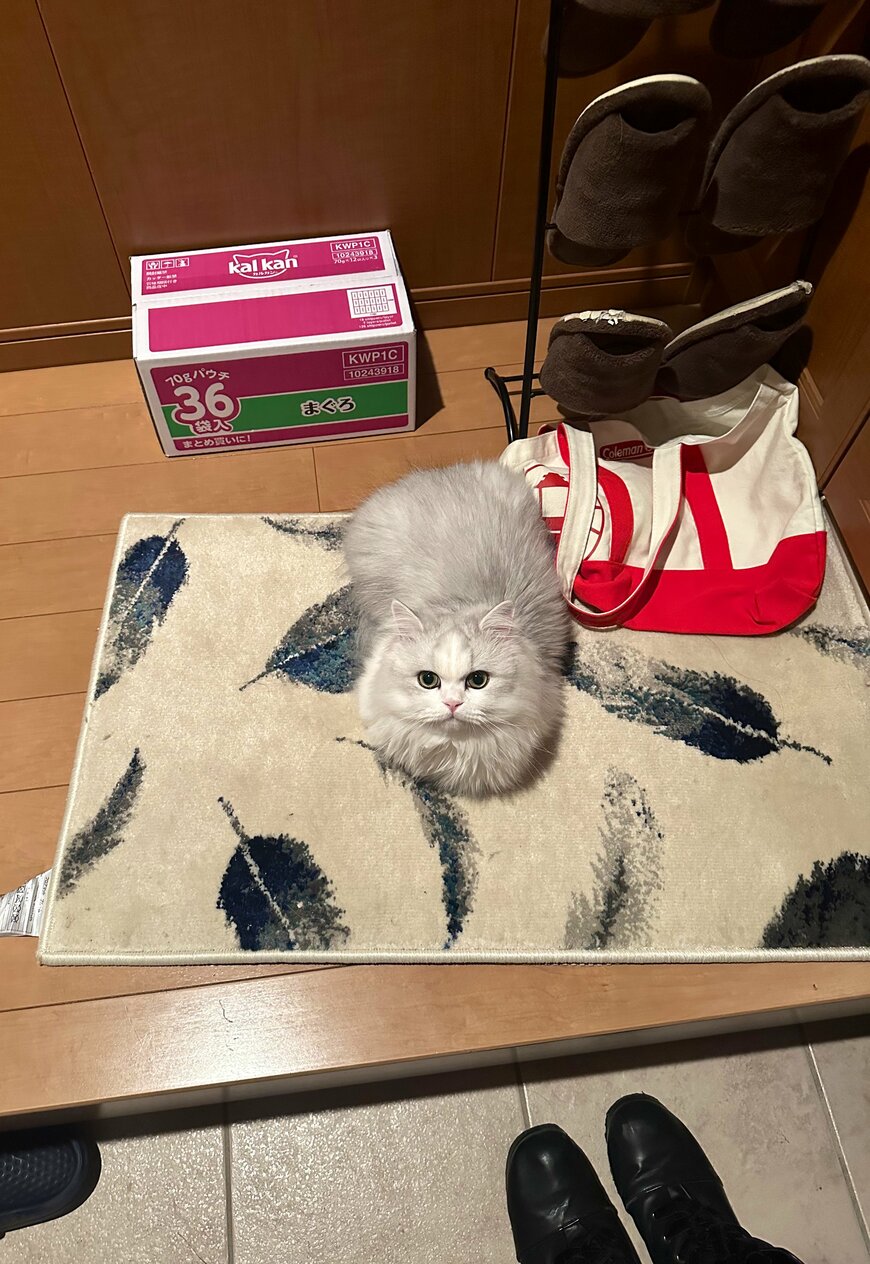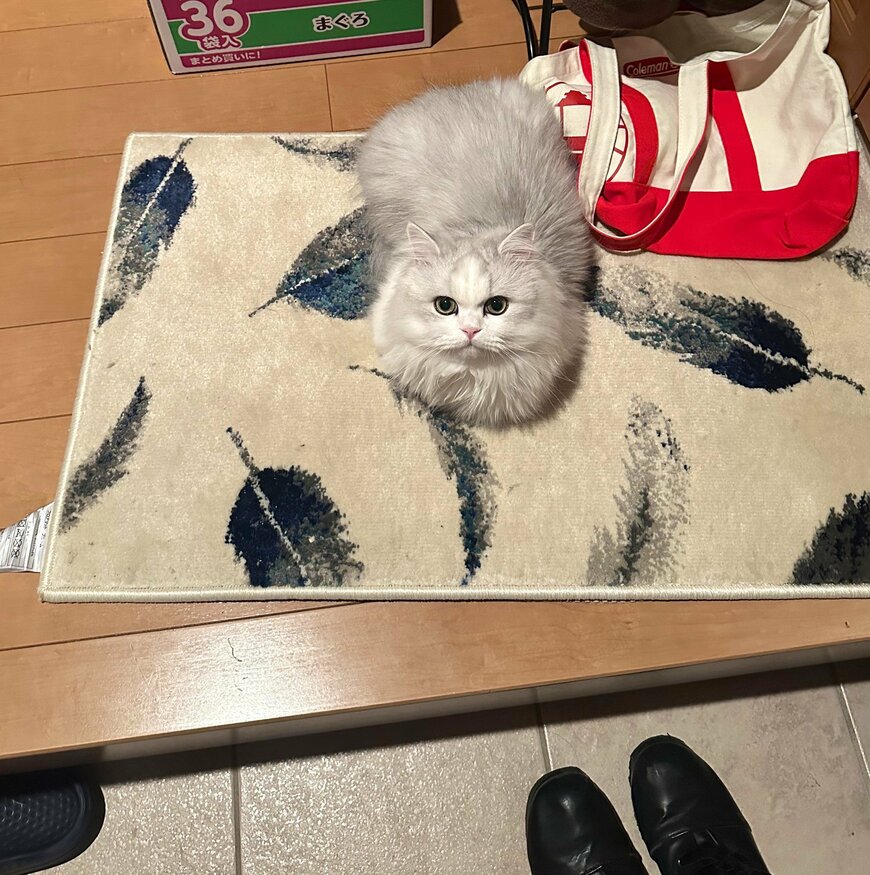 リプライ欄のコメントによると、こちらは投稿主さんの帰宅時の光景だったそう。まん丸フォルムで玄関に座り込むノーマンくんの姿は、まるで大福のように見えてしまいますね……!