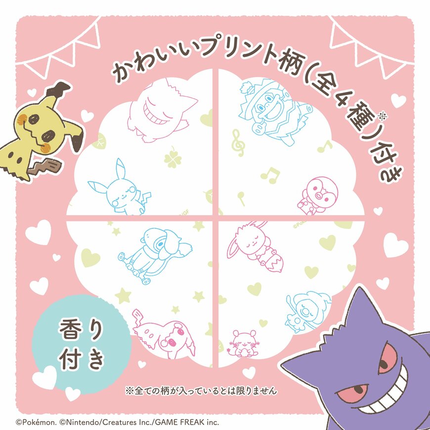 プリント柄は全4種です。いろんなポケモンが楽しそうにしているイラストがかわいいです。4種のデザインがランダムに入っているので、集める楽しさもあります。