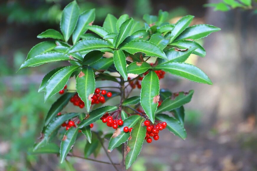 常緑の形のよい葉と赤い実が可愛らしく、庭の植栽にもオススメです。日陰の庭でも育てやすいのが嬉しいですね。