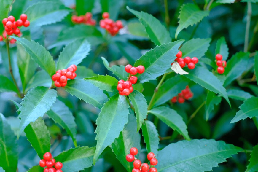 マンリョウ(万両)やセンリョウ(千両)は冬に赤い実がなる常緑植物。たわわに実がなる姿が大変可愛らしく、正月だけでなく、クリスマスにも活躍します。