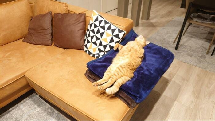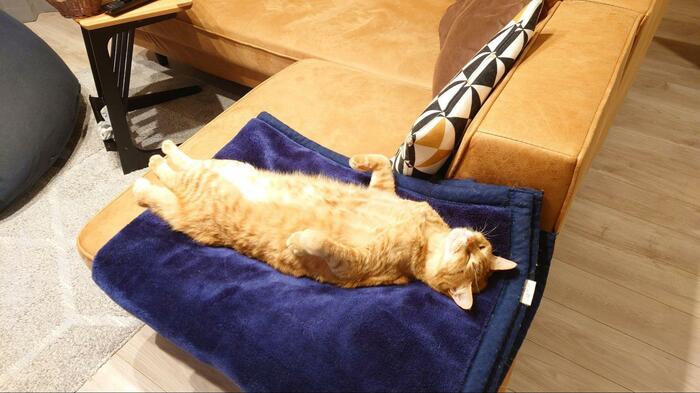 写っているのは、茶トラ柄が印象的な1匹の猫ちゃんです。綺麗に折りたたまれた毛布の上でくつろいでいるようですが……?