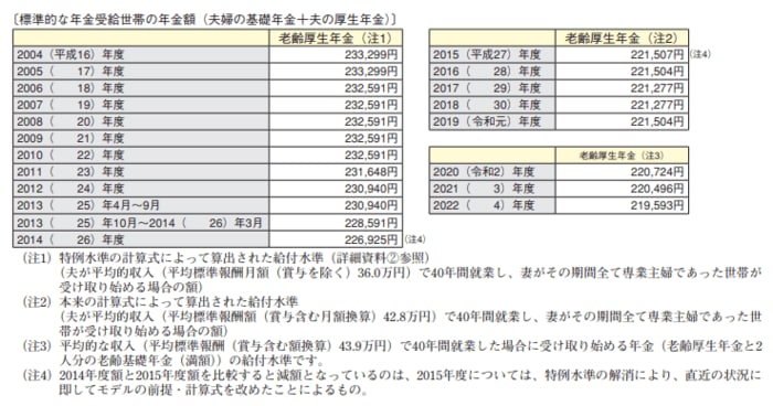 以下は2022年版の厚生労働白書から、標準的な年金受給世帯の年金額の推移をまとめた表 です。年金月額は夫婦2人分の国民年金と夫の厚生年金の合計です。