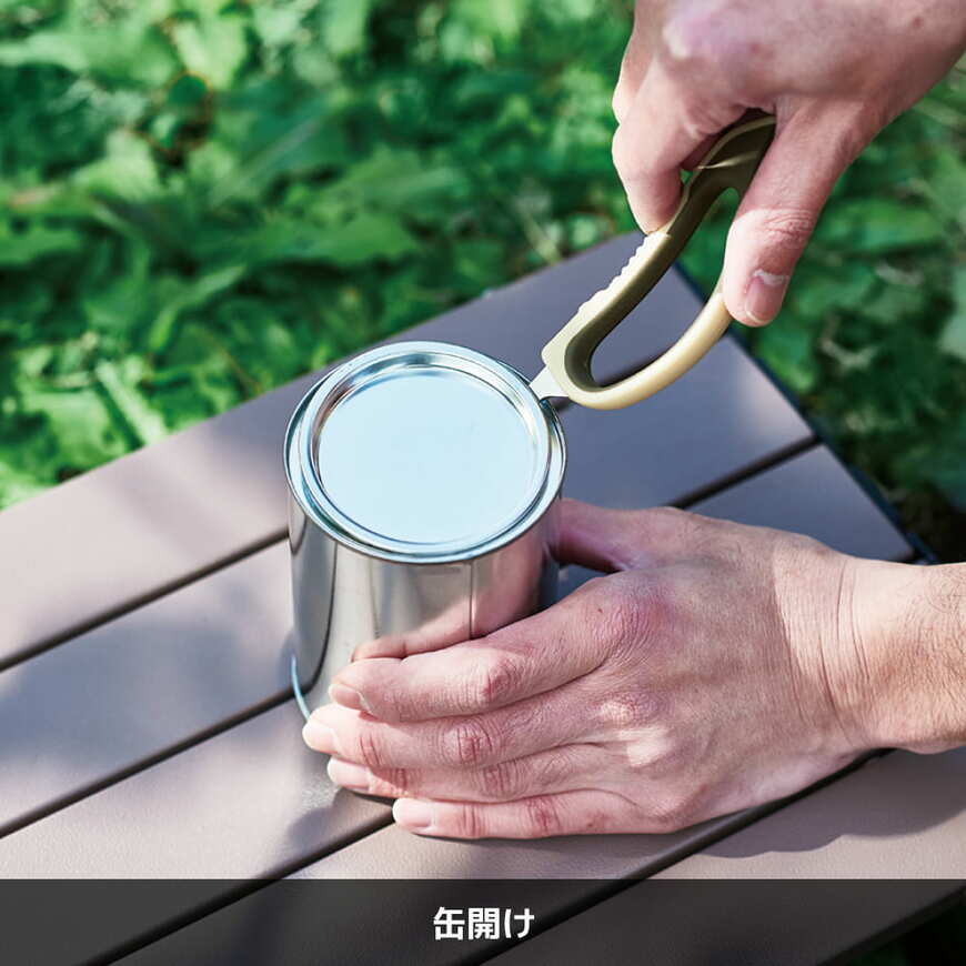持ち手部分が缶開けになっているのが面白いです。アウトドアシーンはもちろん、日常シーンでも役立ちそうです。