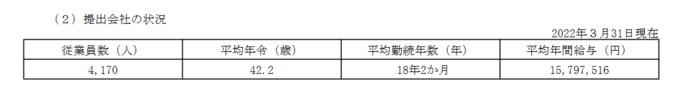 伊藤忠商事(提出会社)の2022年3月末時点での従業員数、平均年齢、平均勤続年数および平均年間給与は以下の通りです。