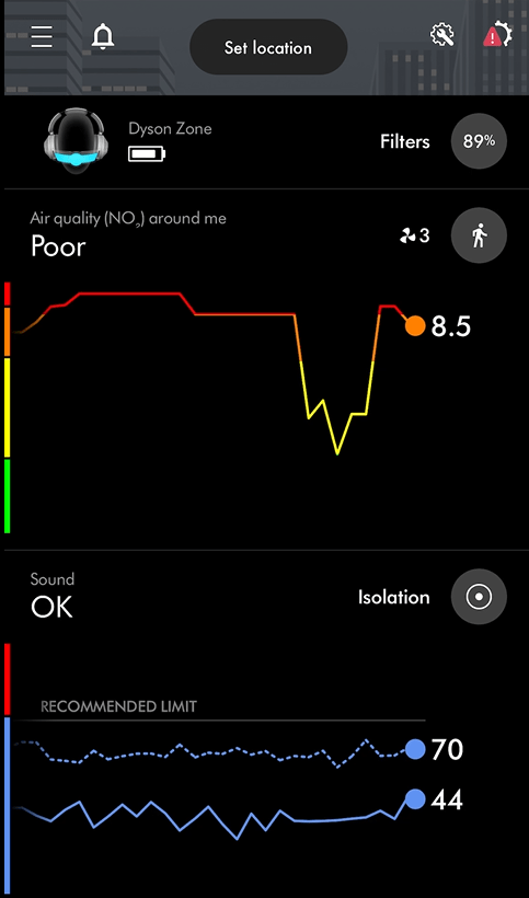 搭載されたセンサーがNO2濃度を監視し、MyDyson™アプリで騒音レベルとともにリアルタイムでモニターします。