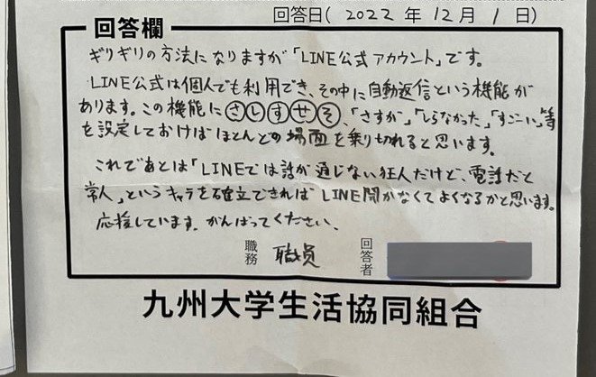 そうすることで、「LINEでは話が通じないが、電話だと常人」というキャラが確立され、LINEを開く必要がなくなるという画期的なアドバイスでした。