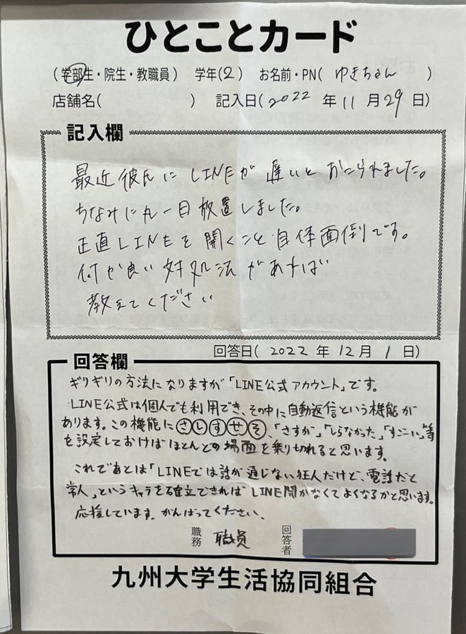 内容は、彼氏からのLINEメッセージを1日放置して、怒られてしまったという女子大学生が書いた「LINEを開くこと自体が面倒です。何か良い対処法があれば教えてください」というメッセージでした。