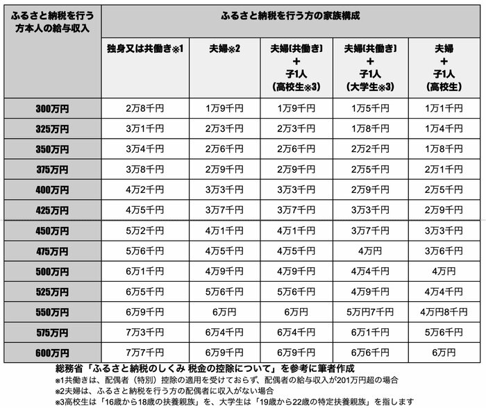 ふるさと納税の目安となる控除上限額を、わかりやすく表にまとめました。