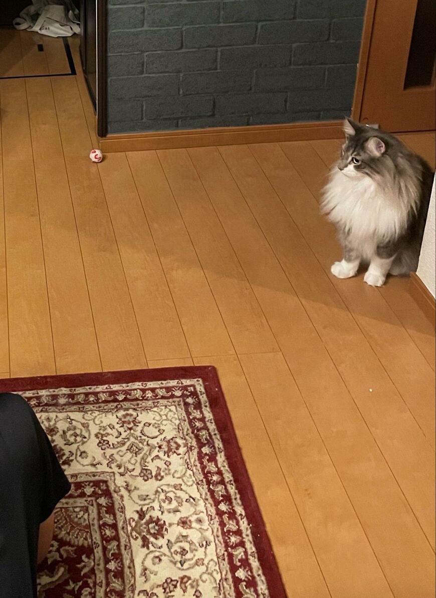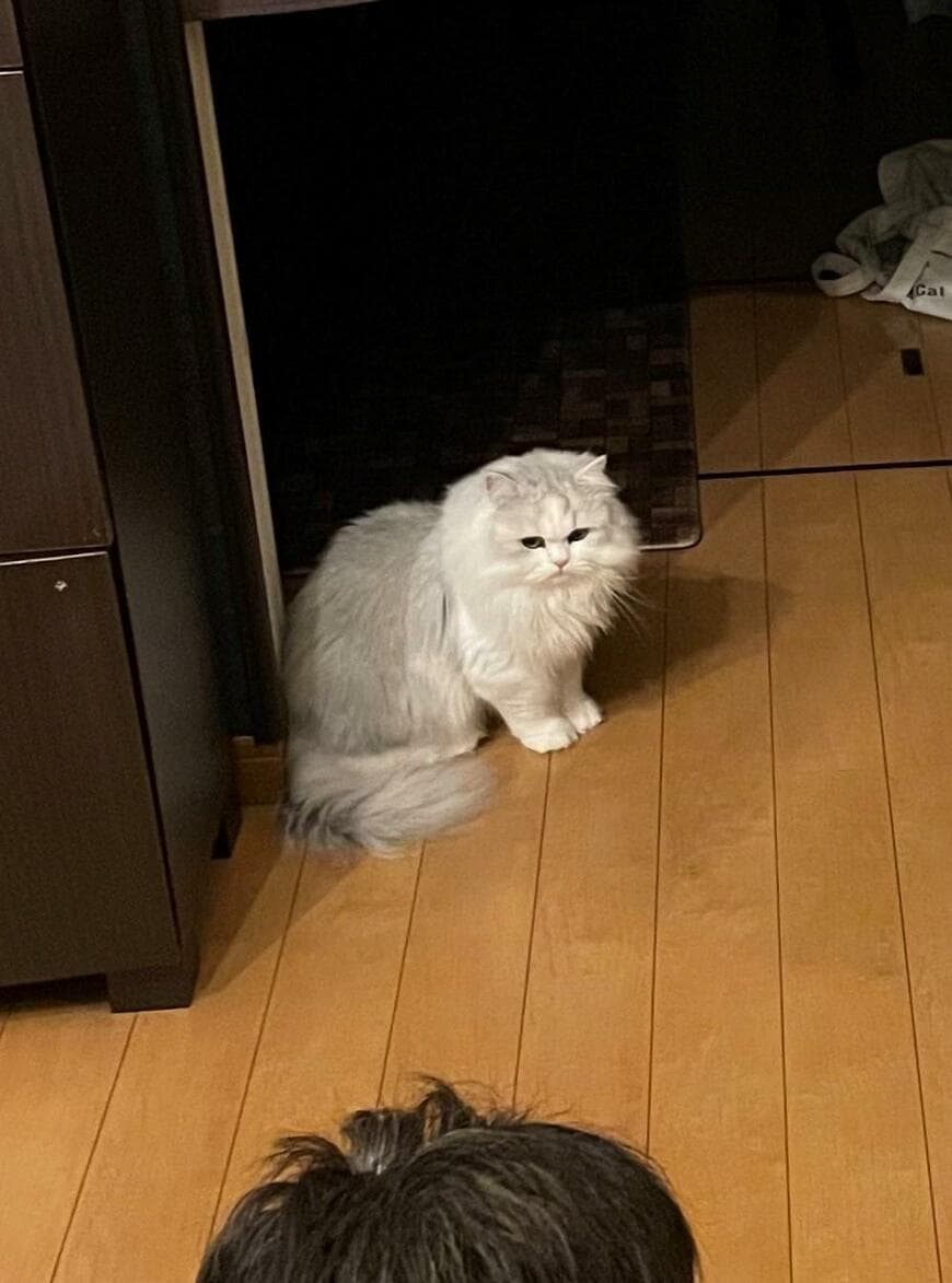 飼い主さんの目の前に座っているのは、ノーマンくんです。目を細めて体を丸めるノーマンくんからは、どこか警戒心が感じられます……!