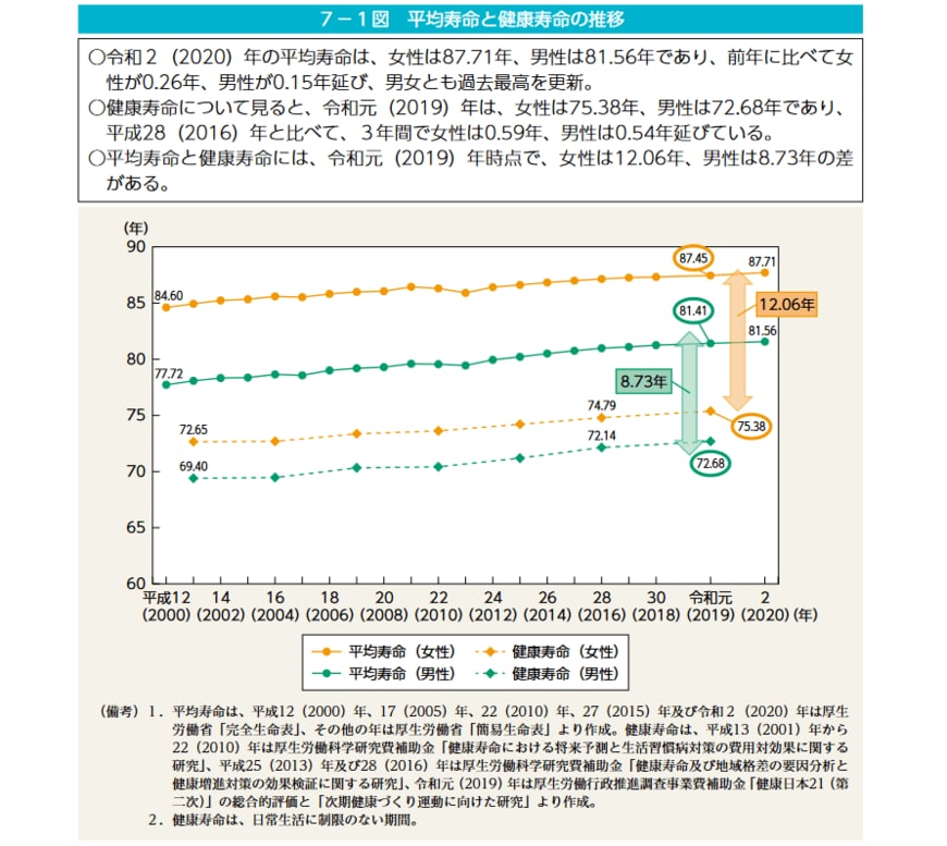 内閣府「男女共同参画白書 令和4年版」によれば、健康寿命は男性で72.68歳、女性で75.38歳。
