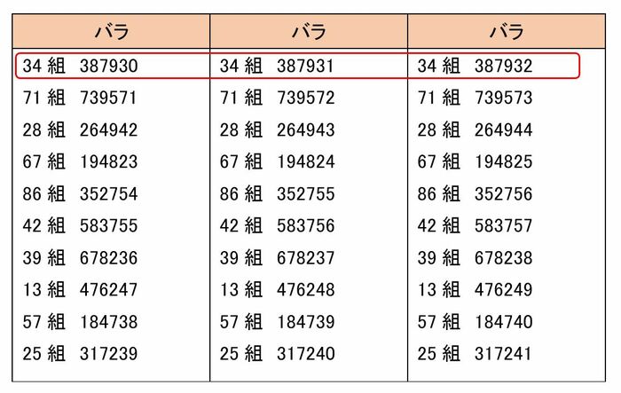10枚1セットのバラを3セット購入する方法です。3セットを横に並べてみると続き番号になるので、バラなのに1等と前後賞が狙える買い方です。