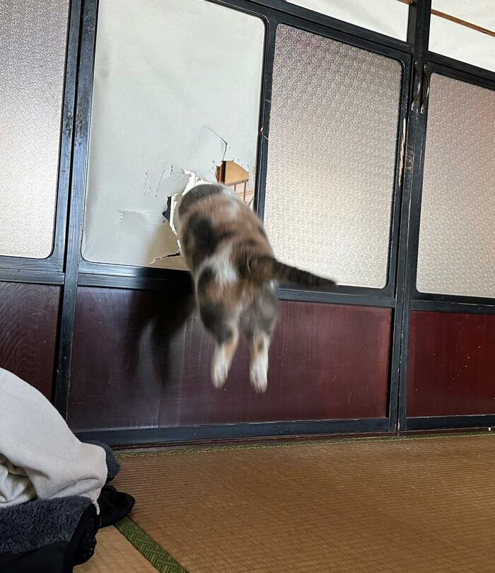 しっかりと障子紙のある戸をロックオンした様子の猫さん。投稿を通じて、ダイナミックに飛ぶ猫さんの「決定的瞬間」が目にとまった人は多いようです。